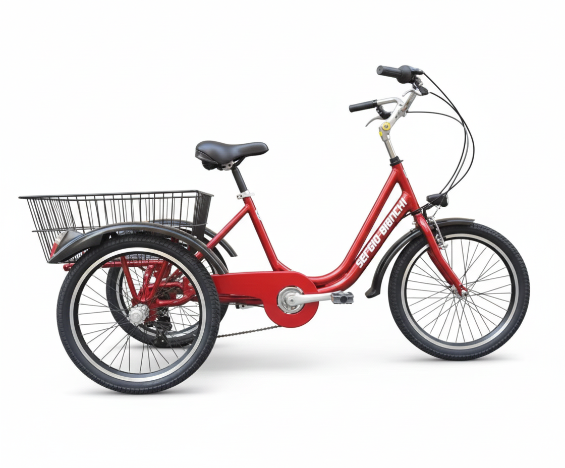A safe, comfortable, and stylish tricycle! The durable aluminum frame and Shimano gears add a modern touch and ensure stability and safety! Ride safely on this three-wheeled tricycle.