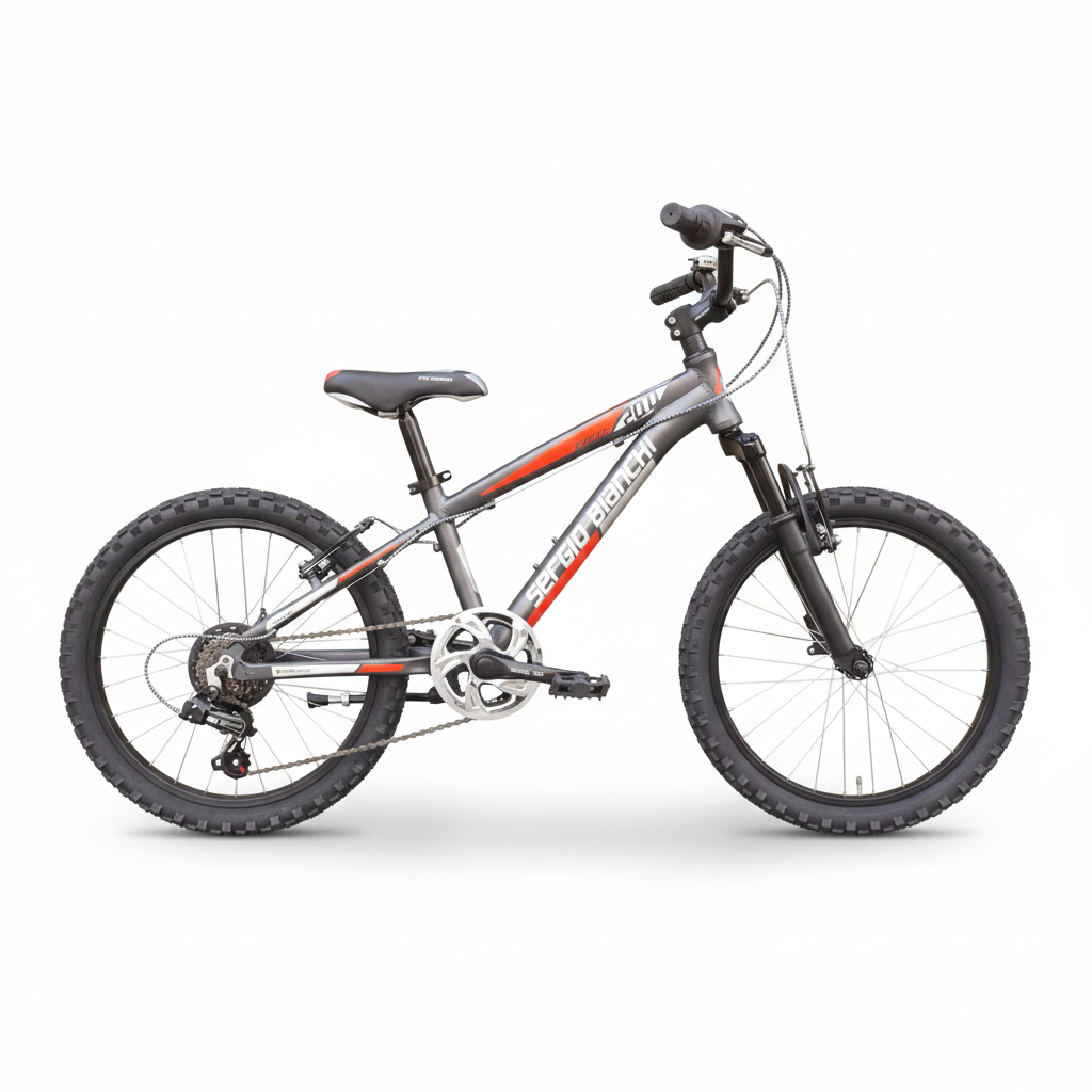 Sergio Bianchi's 20-inch aluminum mountain bike with suspension fork is the perfect bike for kids ages 6 to 8 who want to experience true off-road adventures on a lightweight, high-performance bike. The aluminum frame is lighter than steel, making it easier to ride and control, while the suspension fork absorbs shock for greater comfort on rough terrain.