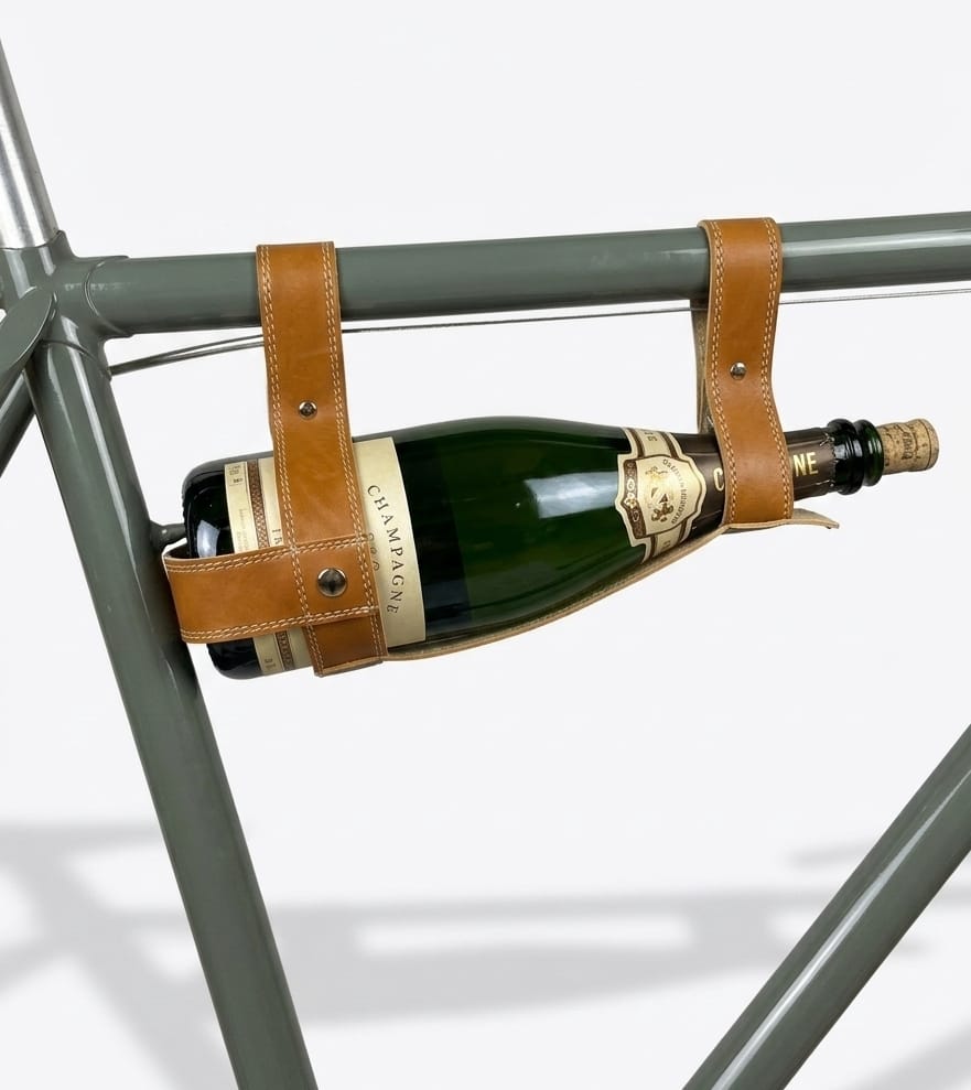 Take your favorite bottle of wine with you on your rides with our unique bike bottle holder. Perfect for wine tours, picnics in the countryside, or simply carrying a bottle home after shopping.