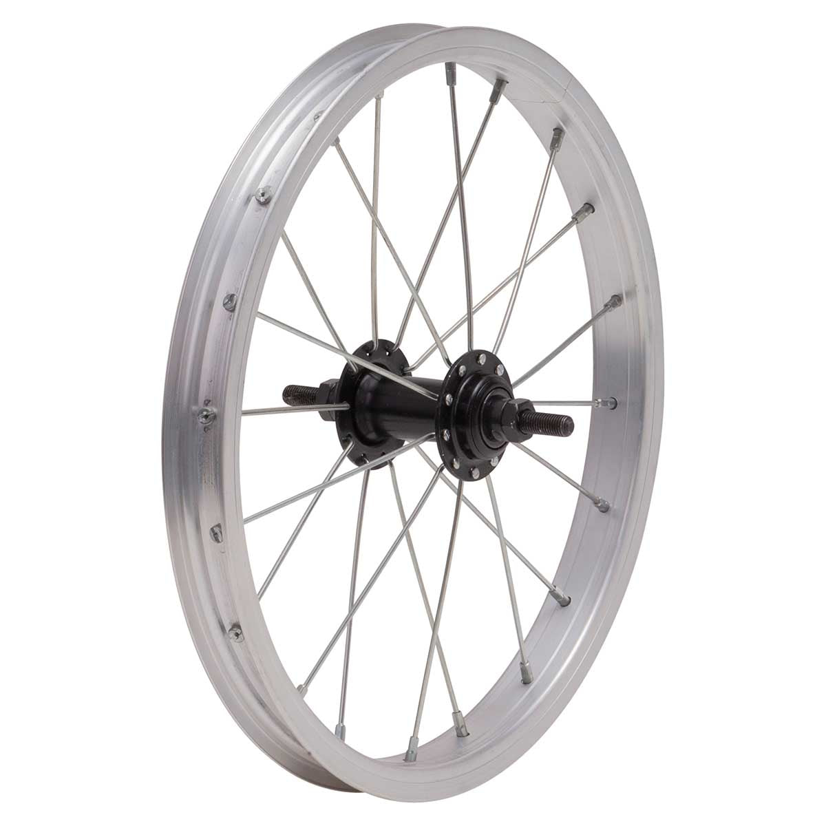 The 14 x 1.3/8 front wheel with aluminum rim and steel hub offers lightness, strength and smoothness for children's bikes and compact city bikes.