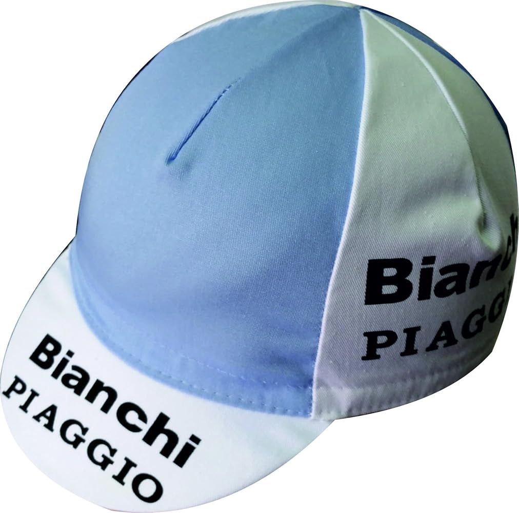 Questo cappellino Bianchi Piaggio riporta alla mente i tempi d'oro del ciclismo, ricordando alcune delle grandi squadre e degli sponsor di un tempo.