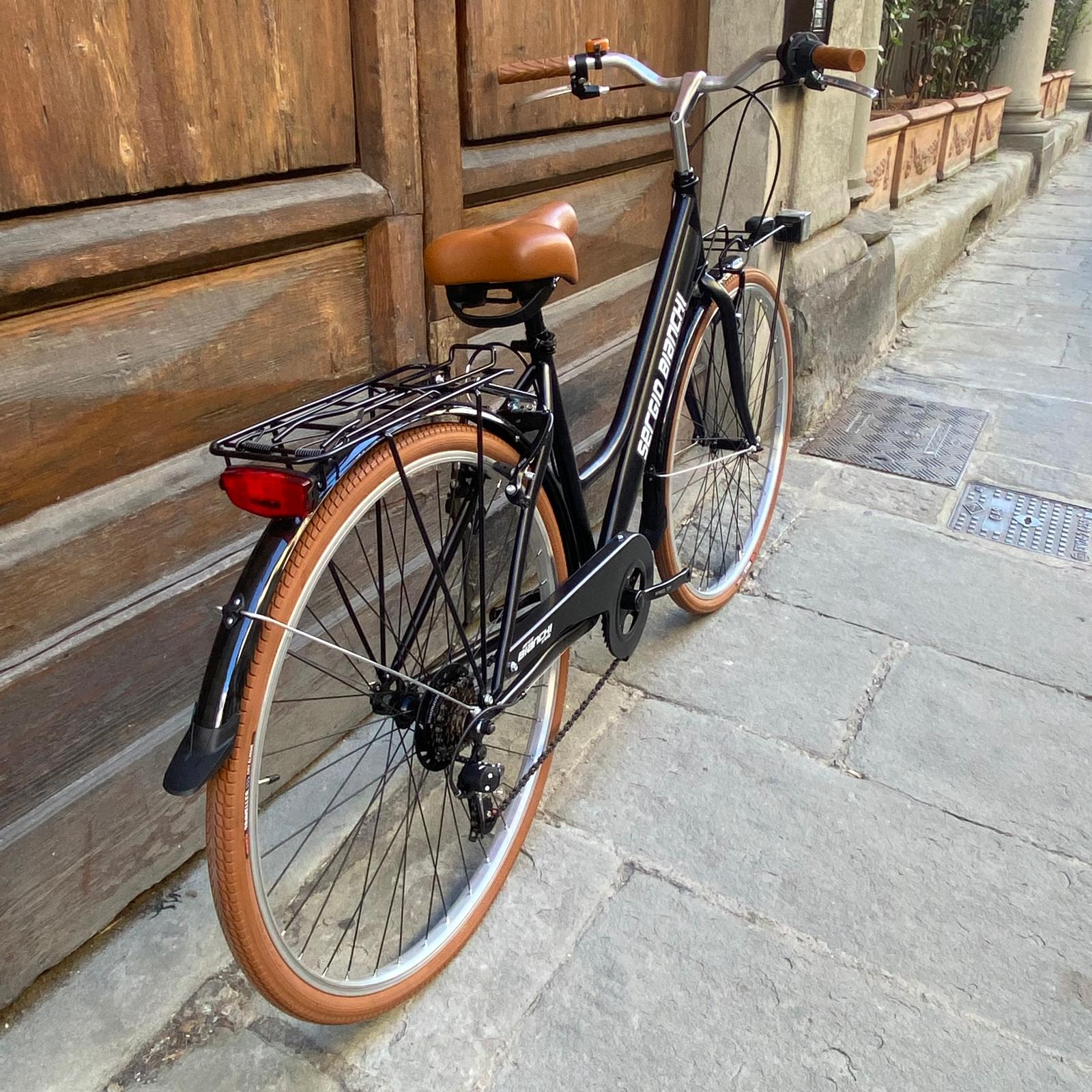 Elegante city bike donna in raffinato nero, perfetta per muoverti in città con stile e comfort. Dotata di sella, manopole e copertoni in caldo marrone che creano un contrasto sofisticato e di grande classe.