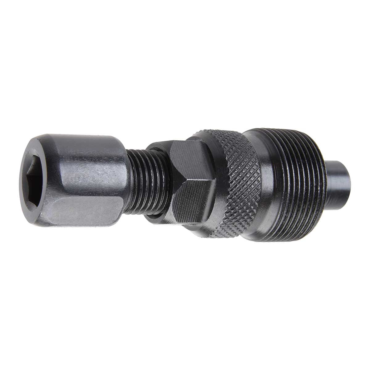L'estrattore si avvita nel filetto interno della pedivella e, ruotando la vite centrale, spinge il perno quadro fuori dalla sua sede, permettendo la rimozione senza danneggiare i componenti.