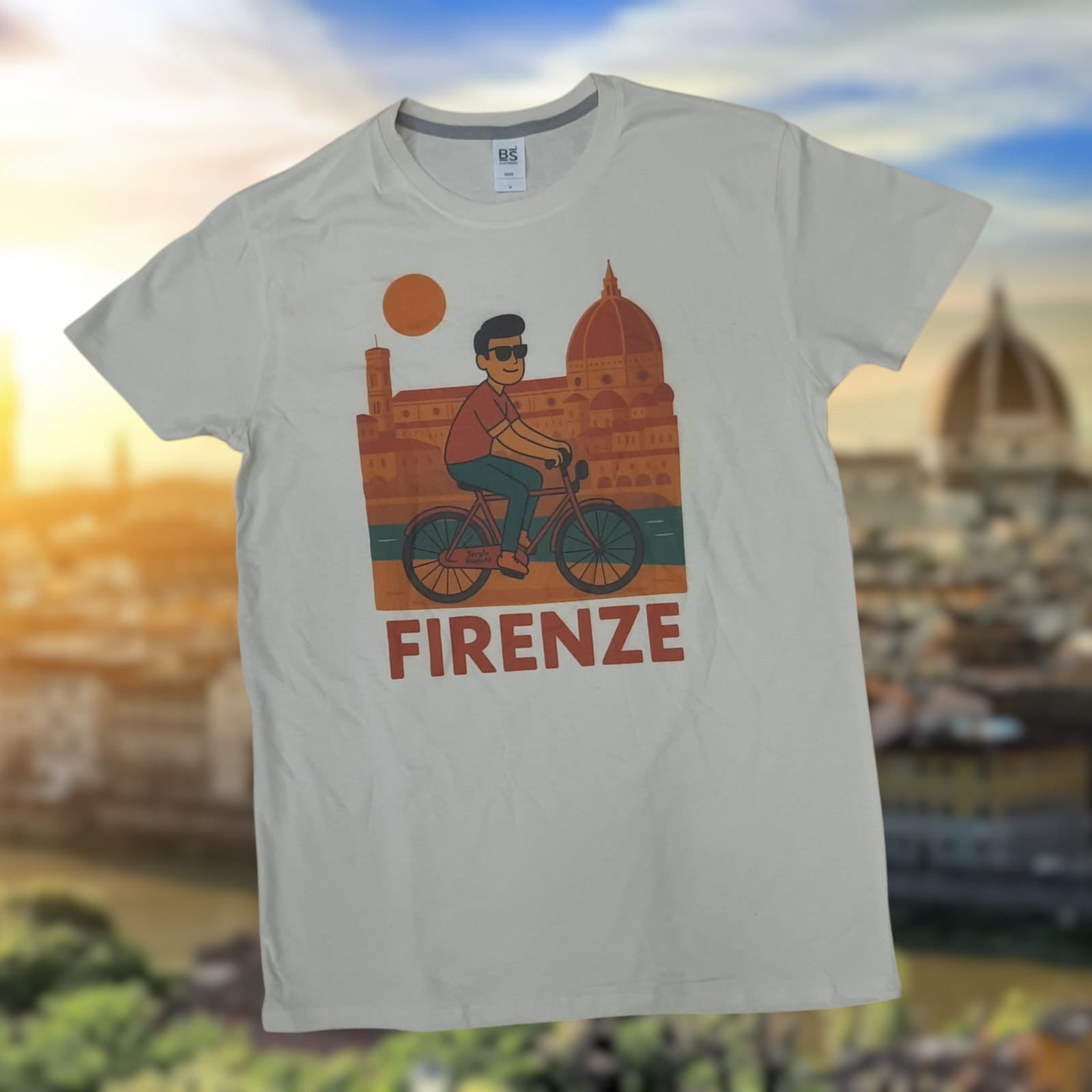 Celebra l'amore per Firenze e le due ruote con questa t-shirt dal design esclusivo. Un ciclista con occhiali da sole pedala elegantemente davanti allo skyline iconico di Firenze, dominato dalla maestosa Cupola del Brunelleschi e dal Campanile di Giotto, con il sole toscano che illumina la scena.