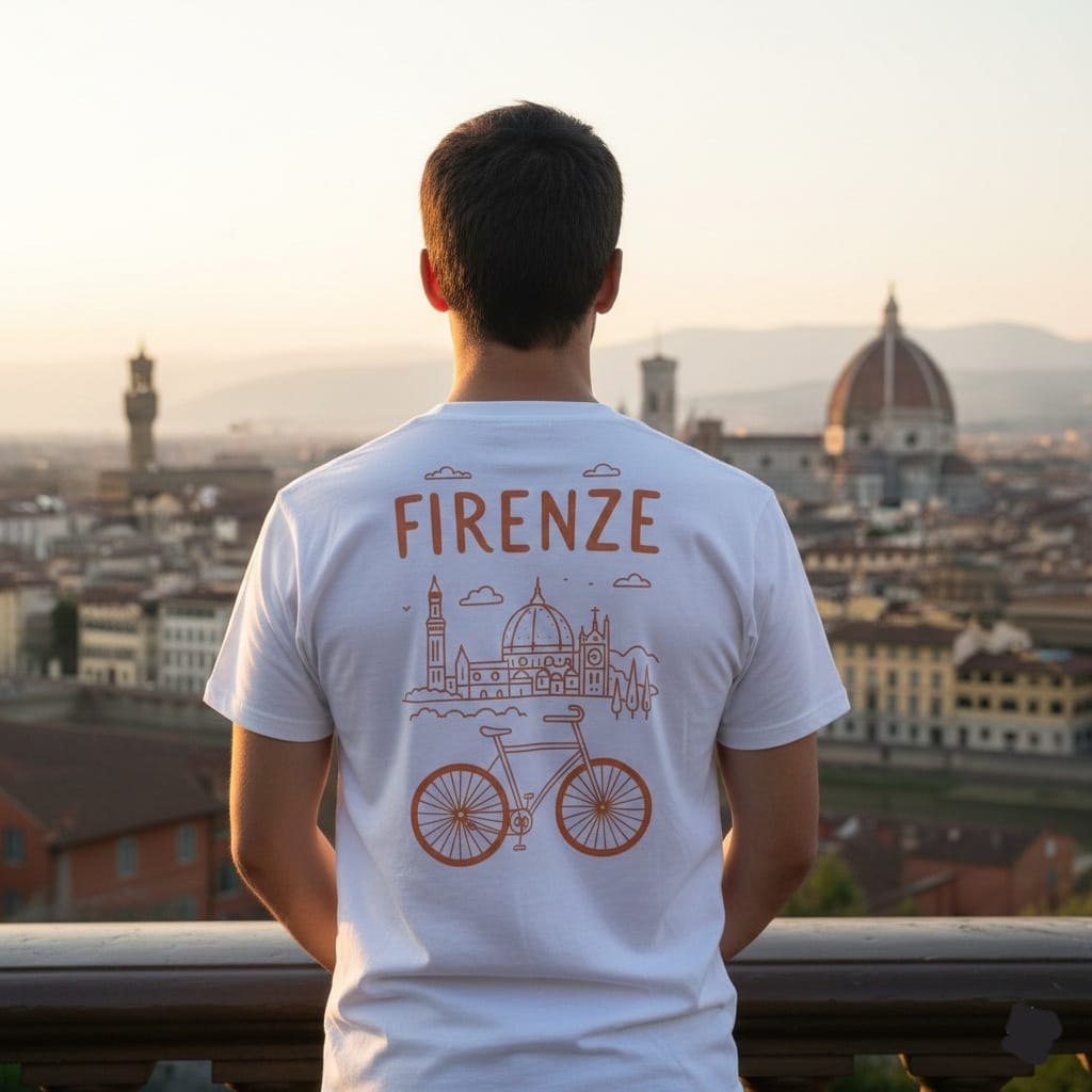 Celebra la bellezza di Firenze e la passione per le due ruote con questa t-shirt dal design esclusivo che unisce i monumenti più iconici della città con una bicicletta stilizzata. Perfetta per ciclisti urbani, appassionati di cultura fiorentina.