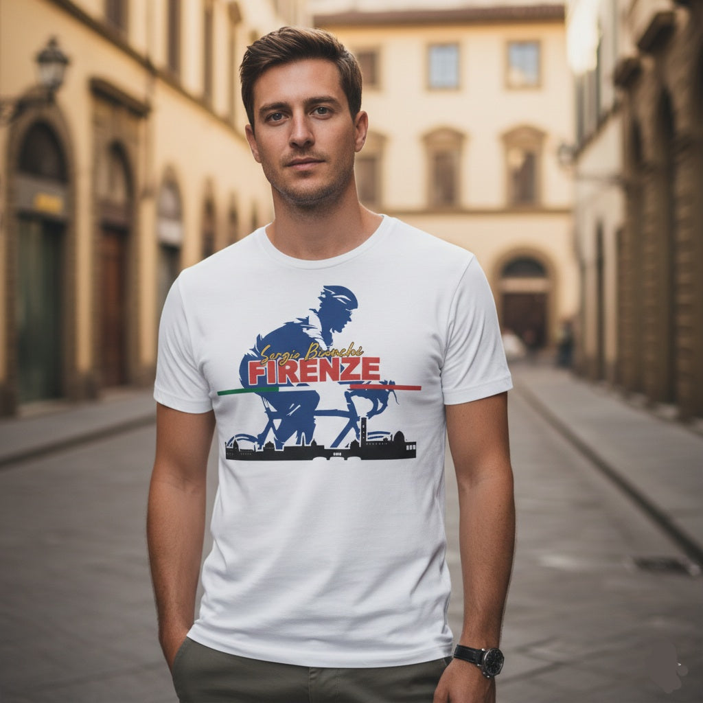 Questa t-shirt è perfetta per gli appassionati di ciclismo e di Firenze. La grafica rappresenta la skyline della bellissima città e un ciclista in movimento.